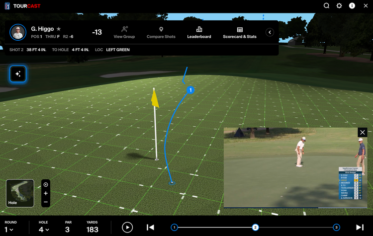 Now you can view AI commentary in TOURCAST, which provides written context for every shot by every player during PGA TOUR events, starting with THE PLAYERS Championship at TPC Sawgrass. The AI commentary not only describes each shot but also provides context for what that shot means for each player based on their current performance and upcoming shot, as well as how it relates to the broader competition. Click on the blue pulsing icon on the right to test it out.