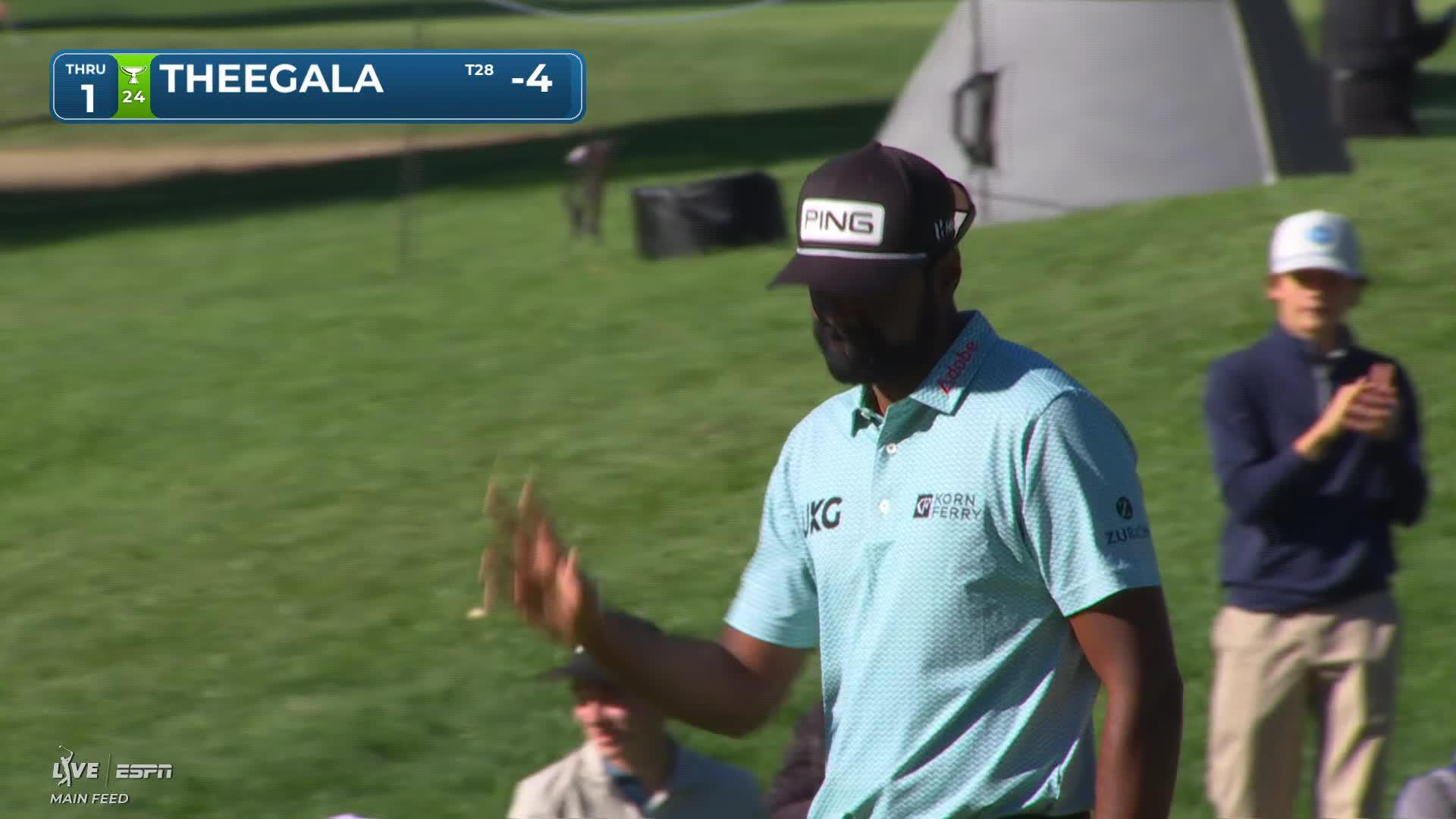 Sahith Theegala holes 29-foot eagle putt on No. 1 at The Genesis
